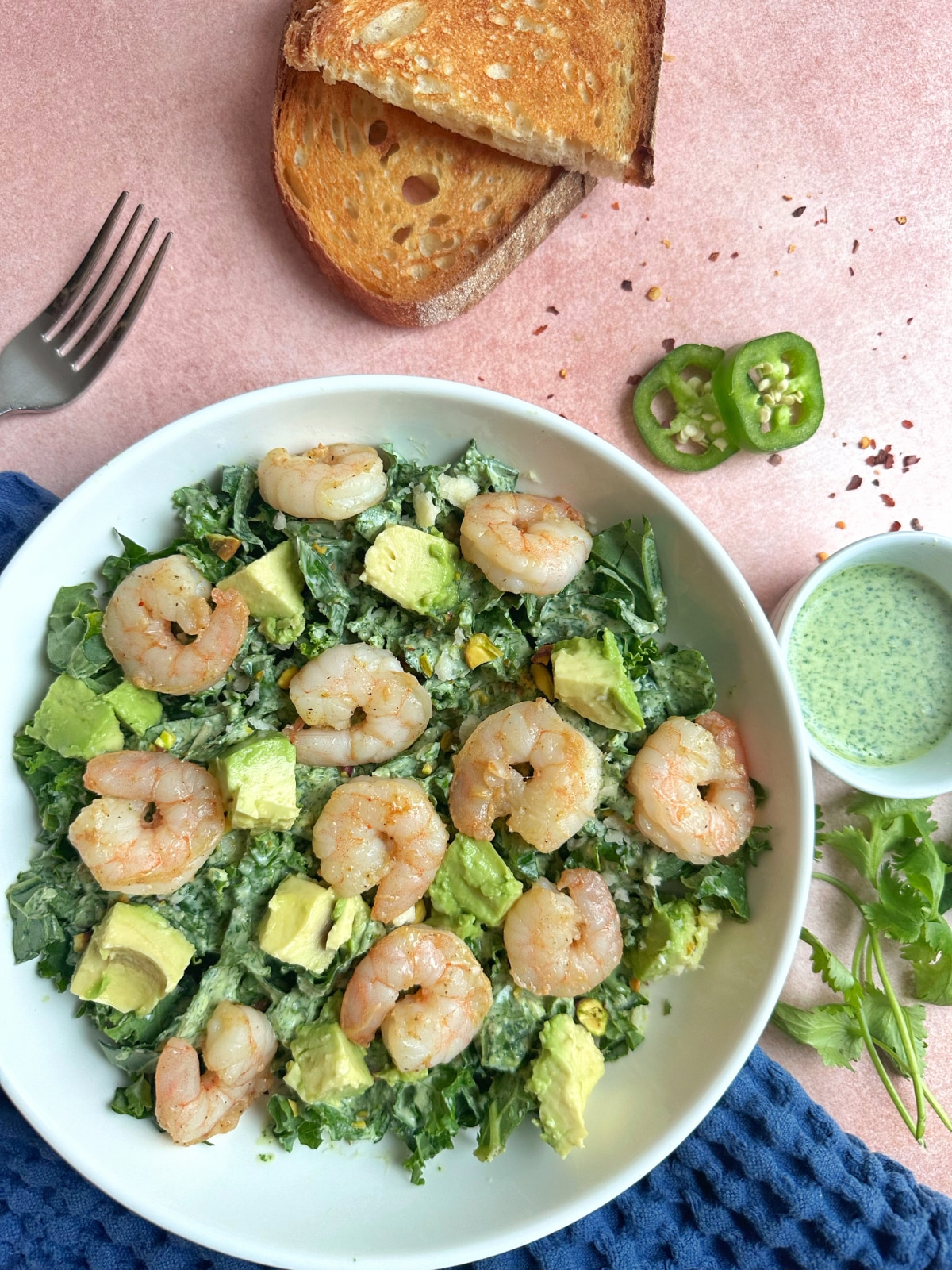 A bowl of kale, avocado, and grilled shrimp with green dressing on the side.